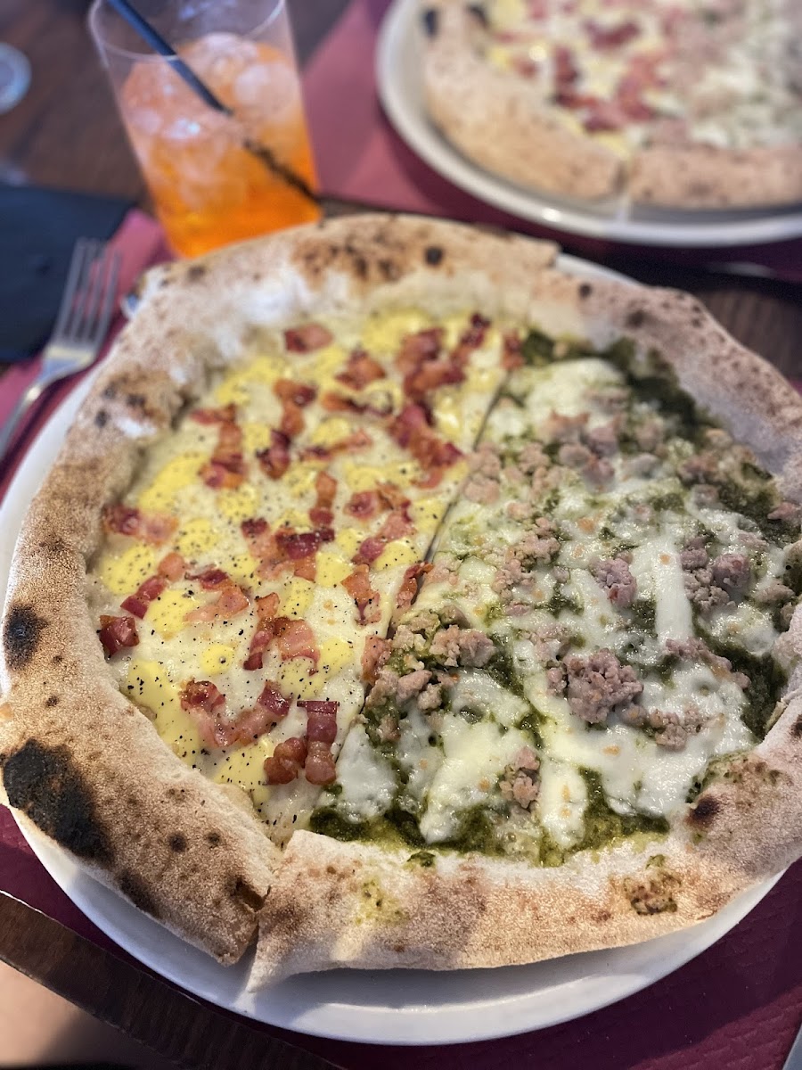 Of course, pizza is the heart of the restaurant, and the variety on the menu reflects that. The Pizza Pistachios, Bacon stands out for its balance of savory and slightly nutty notes. Each bite combines crisp crust with a flavorful topping that feels indulgent without being overwhelming. Another popular choice is the Pizza Con Gamberi E Zucchine. The combination of shrimp and zucchini gives the pizza a lighter feel while still delivering plenty of taste, making it a great option for those looking for something a bit different from the usual selections.